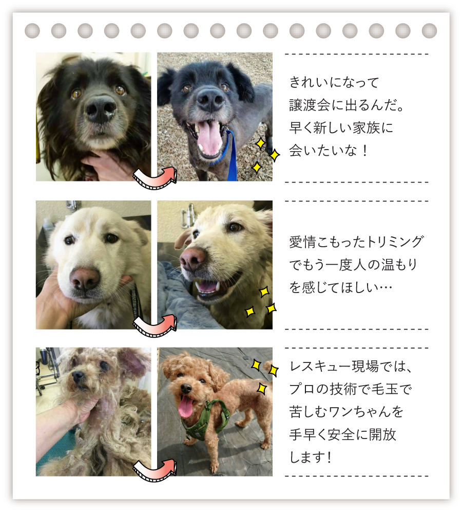 定期的に動物愛護センターへ訪問し、ボランティアトリミングの実施、そして一般からの緊急保護要請にもできるだけ対応しております。